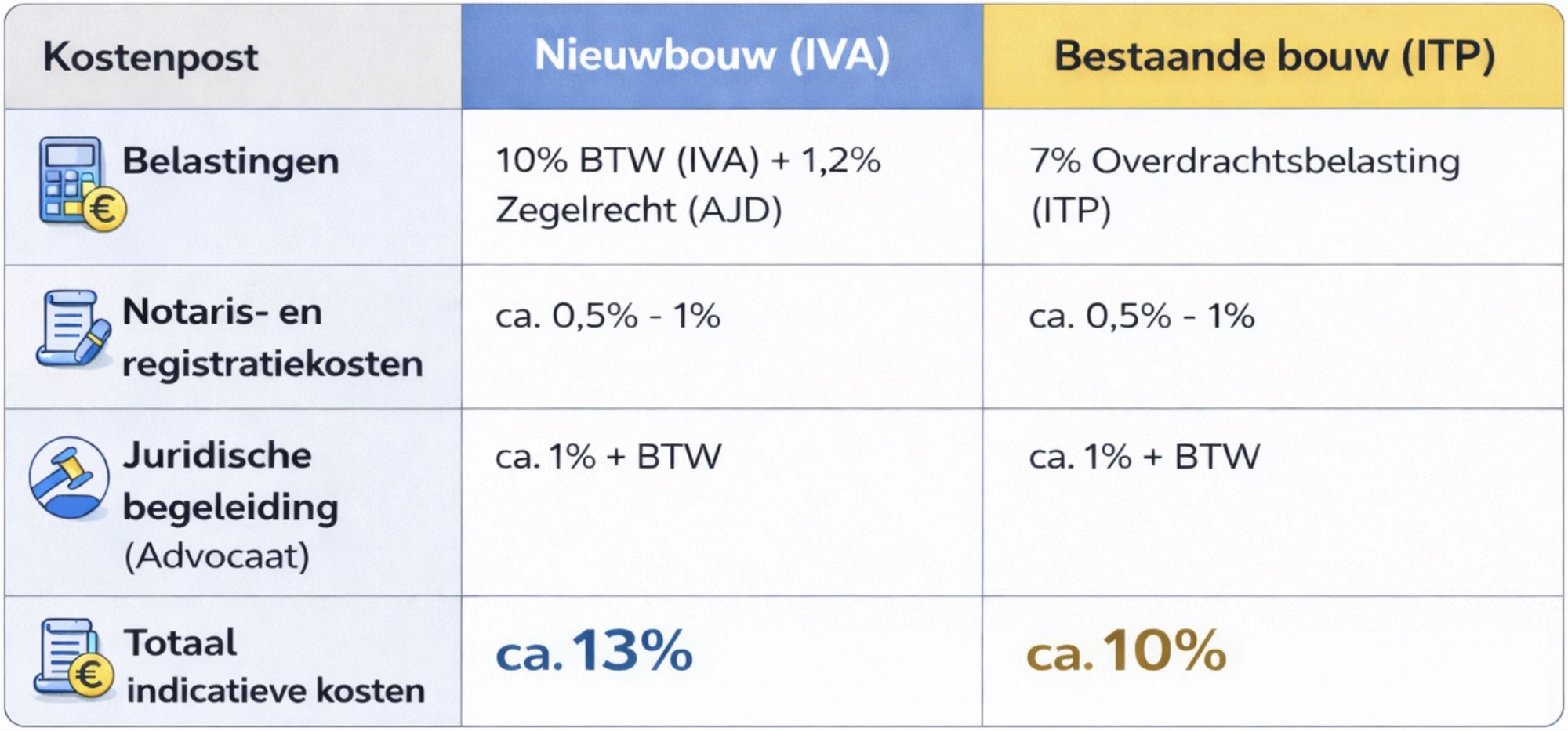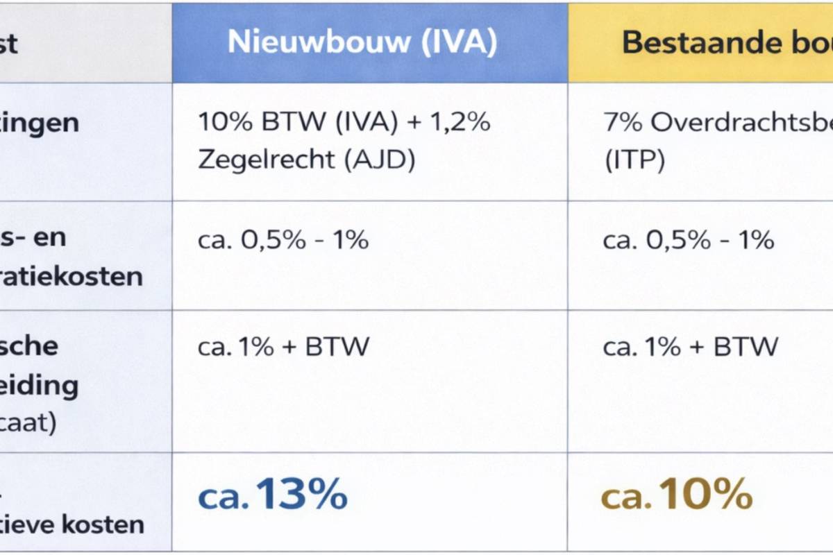 Naast de aankoopprijs moet u rekening houden met enkele extra kosten. In Andalusië ligt dit bij nieuwbouw doorgaans rond de 13% op de prijs en bij een bestaande bouw rond de 10%. Om u een helder beeld te geven van de verschillen tussen nieuwbouw en bestaande bouw, hebben we de kosten hieronder voor u op een rijtje gezet.