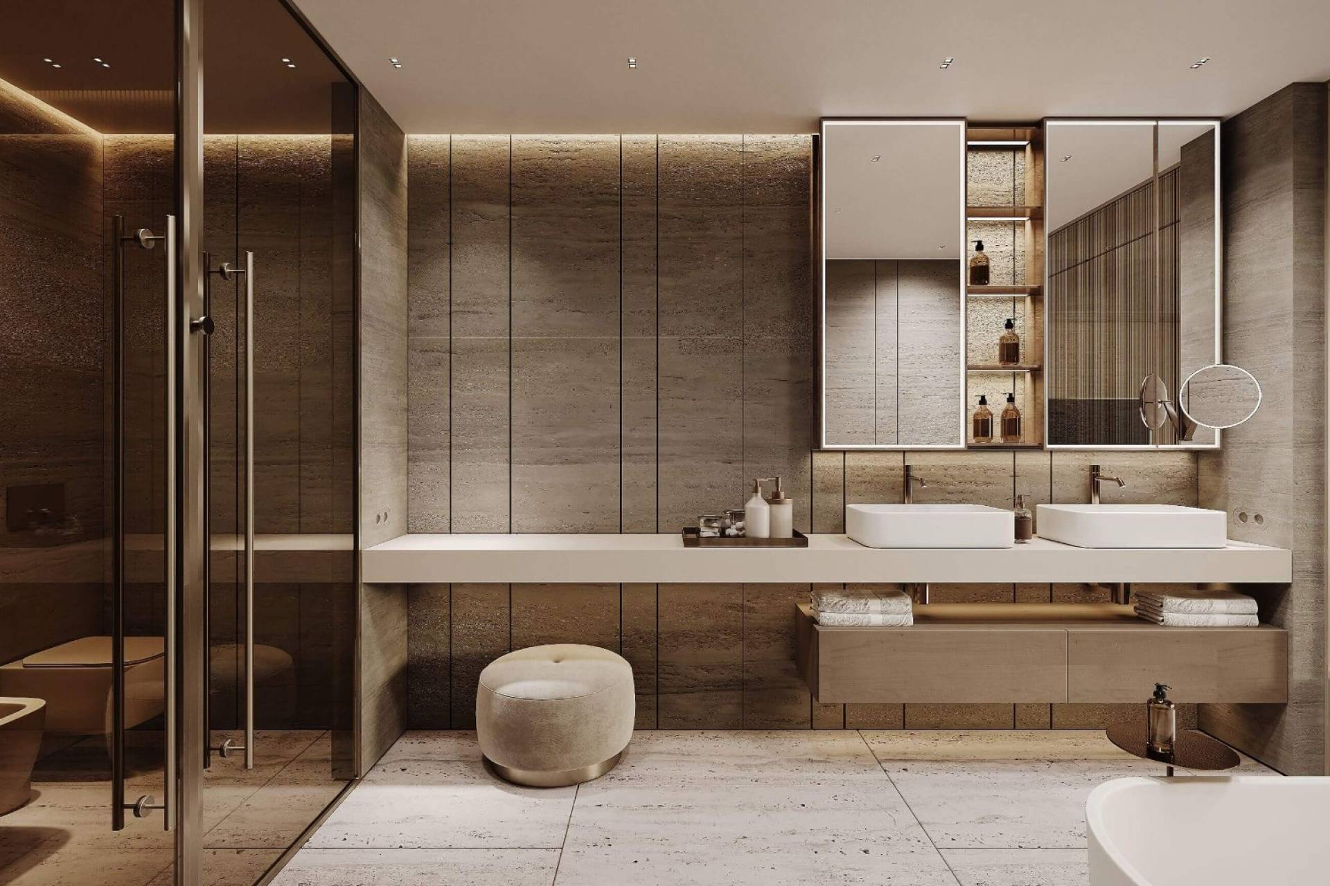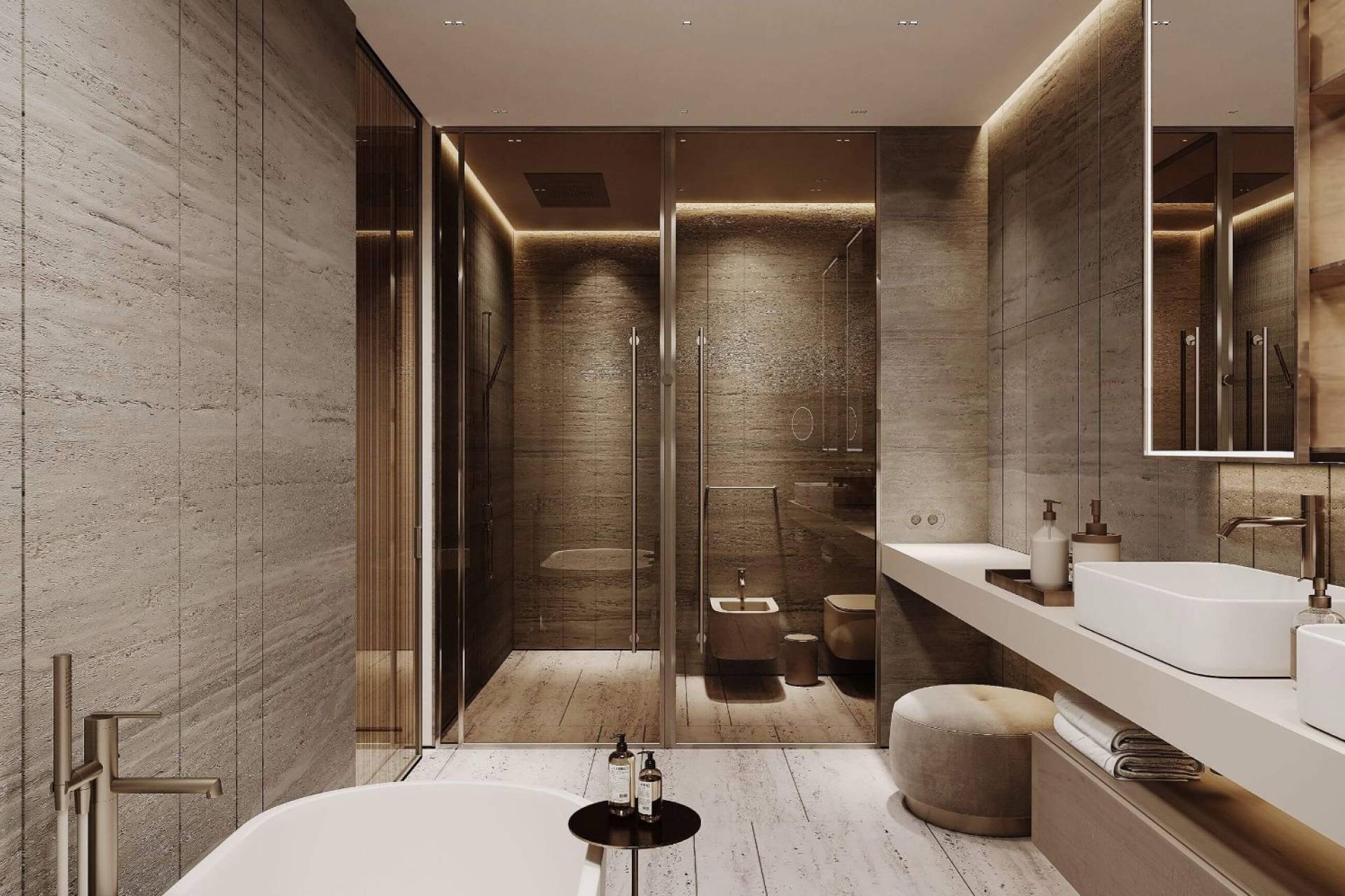 - Ingebouwde kleerkasten, Gessi-sanitair, travertin- en houtvloeren