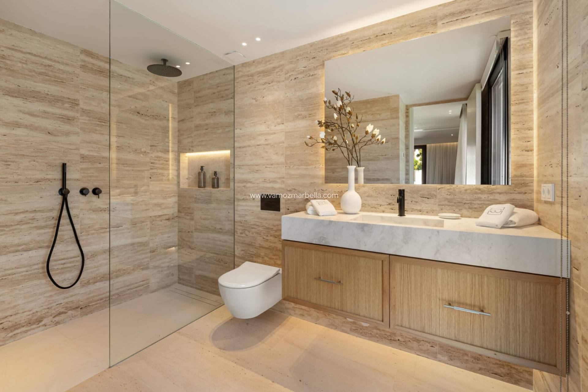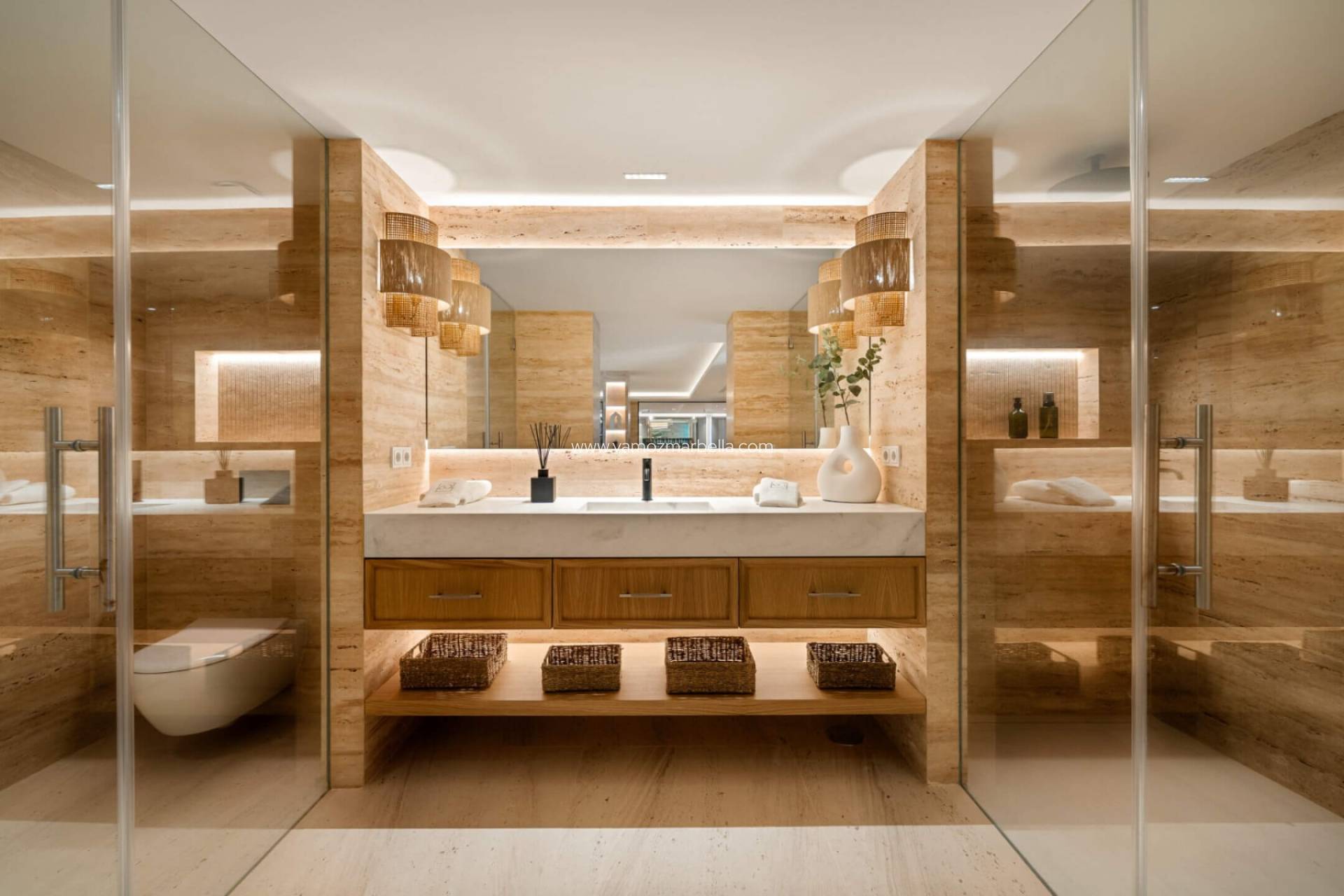 De vijf slaapkamers zijn elegant en sereen, met elk hun eigen en-suite badkamer. Licht neutrale tinten, natuurlijke texturen en vloeiende overgangen zorgen voor een zen-gevoel doorheen de hele woning.