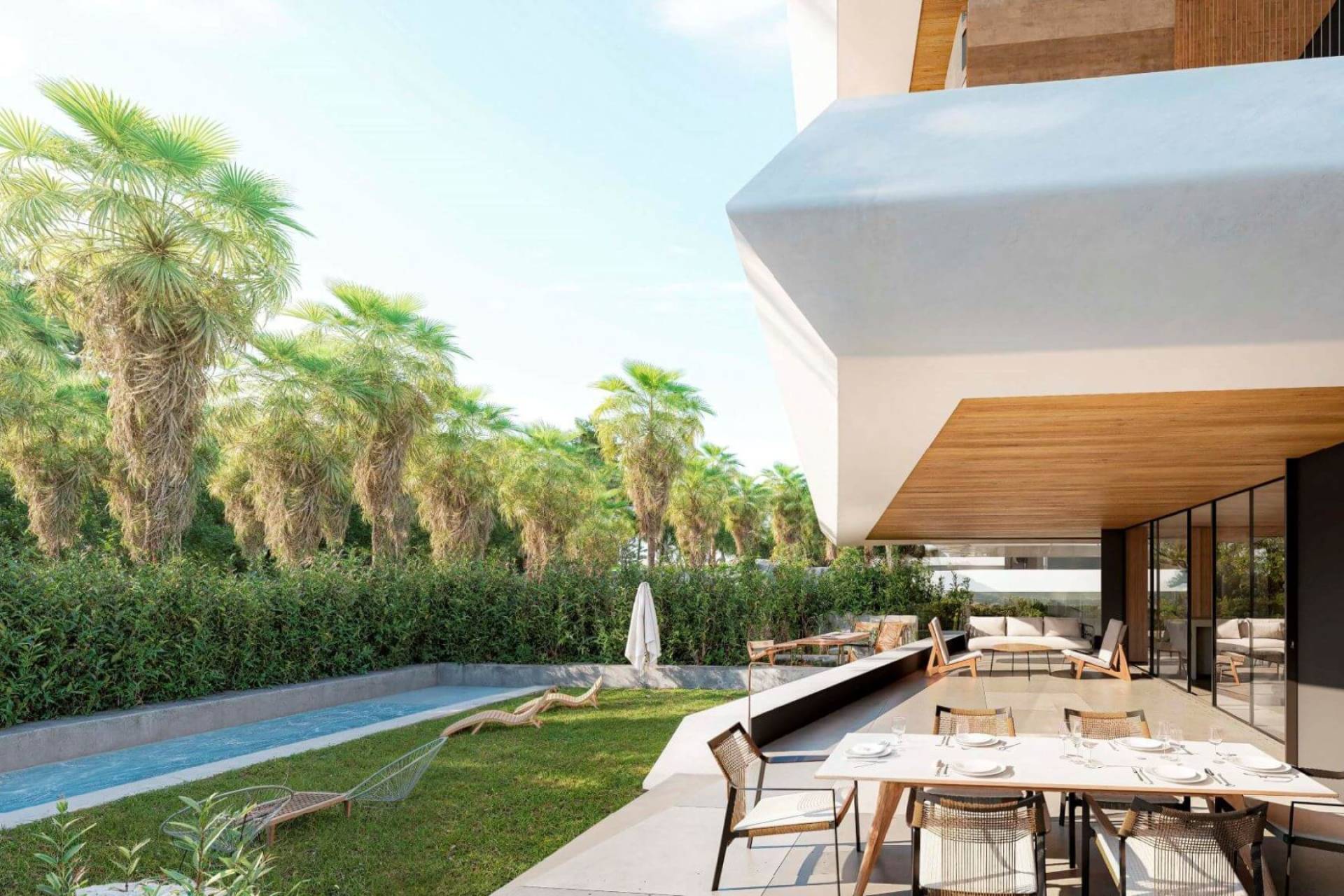 Palm Residences is een boutique nieuwbouwproject in Selwo met een opvallende L-vormige architectuur en cascaderende terrassen vol groen. Elke woning is een hoekappartement, wat zorgt voor extra licht, meer privacy en een open gevoel van ruimte.