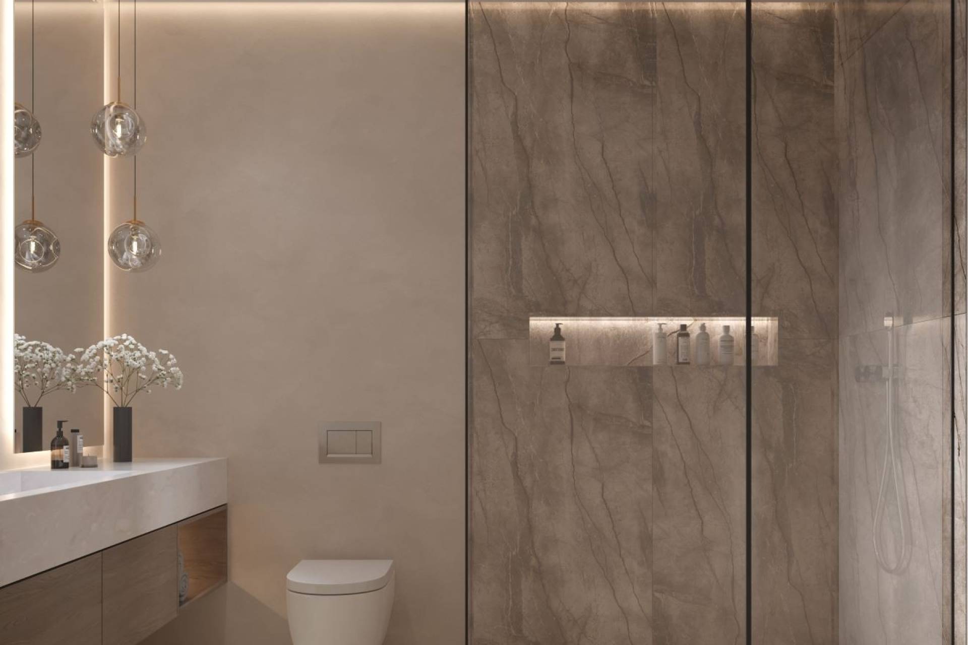 De badkamers zijn stijlvol afgewerkt met hoogwaardige materialen en voorzien van moderne inloopdouches en designsanitair.