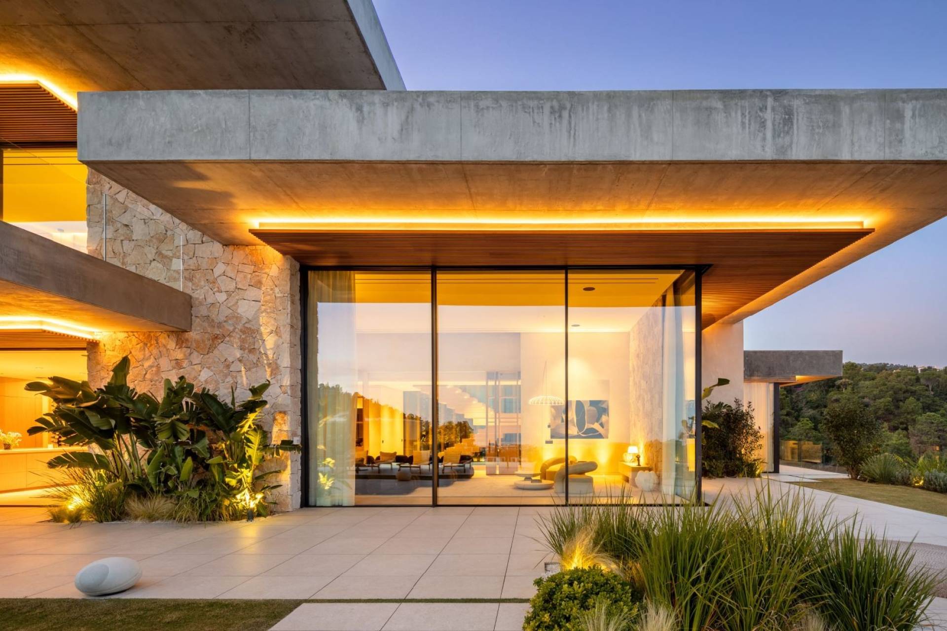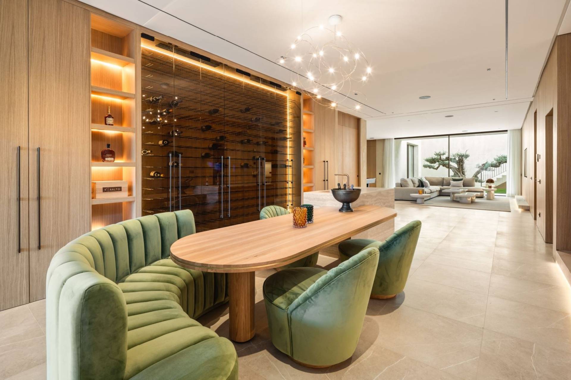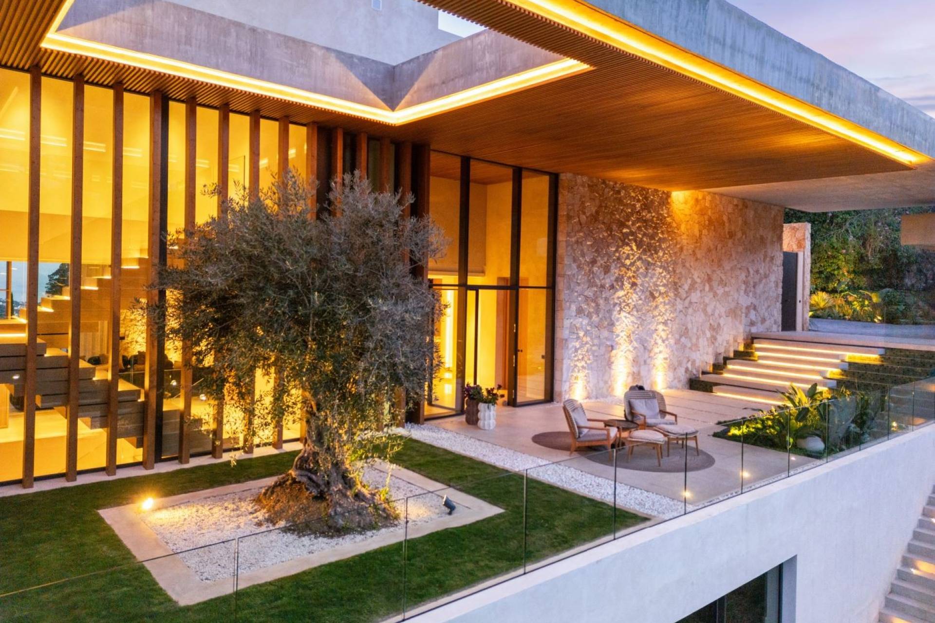 Via een lange private oprijlaan bereikt u de indrukwekkende inkomhal, waar een majestueuze olijfboom en glazen entree meteen de toon zetten. Binnen vloeien de open leefruimtes naadloos in elkaar over, met een stijlvolle zithoek, centrale open haard en grote schuiframen die binnen en buiten verbinden.
